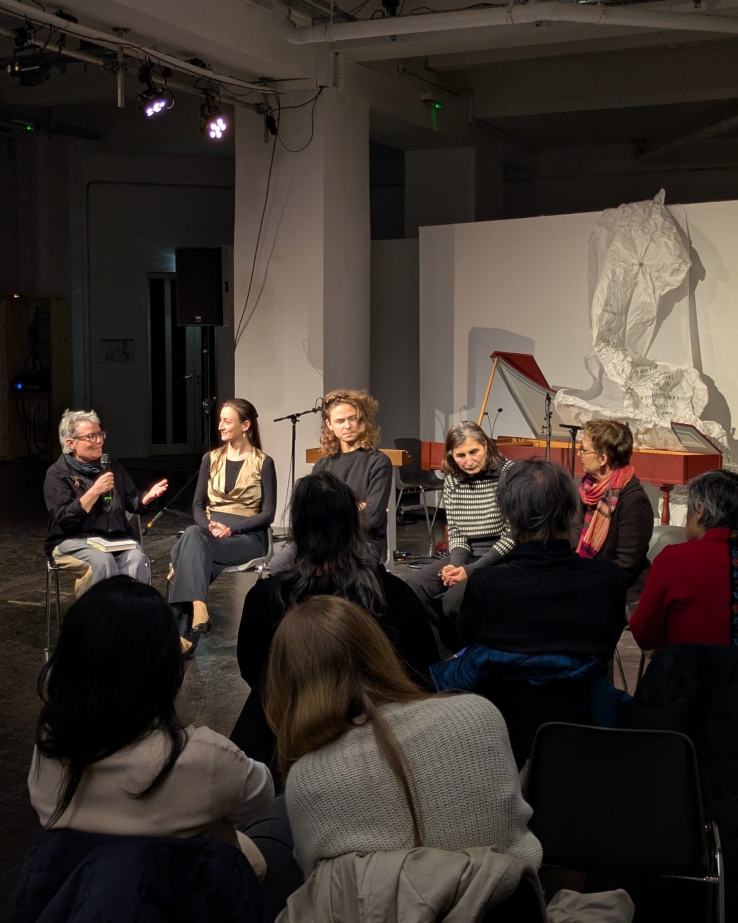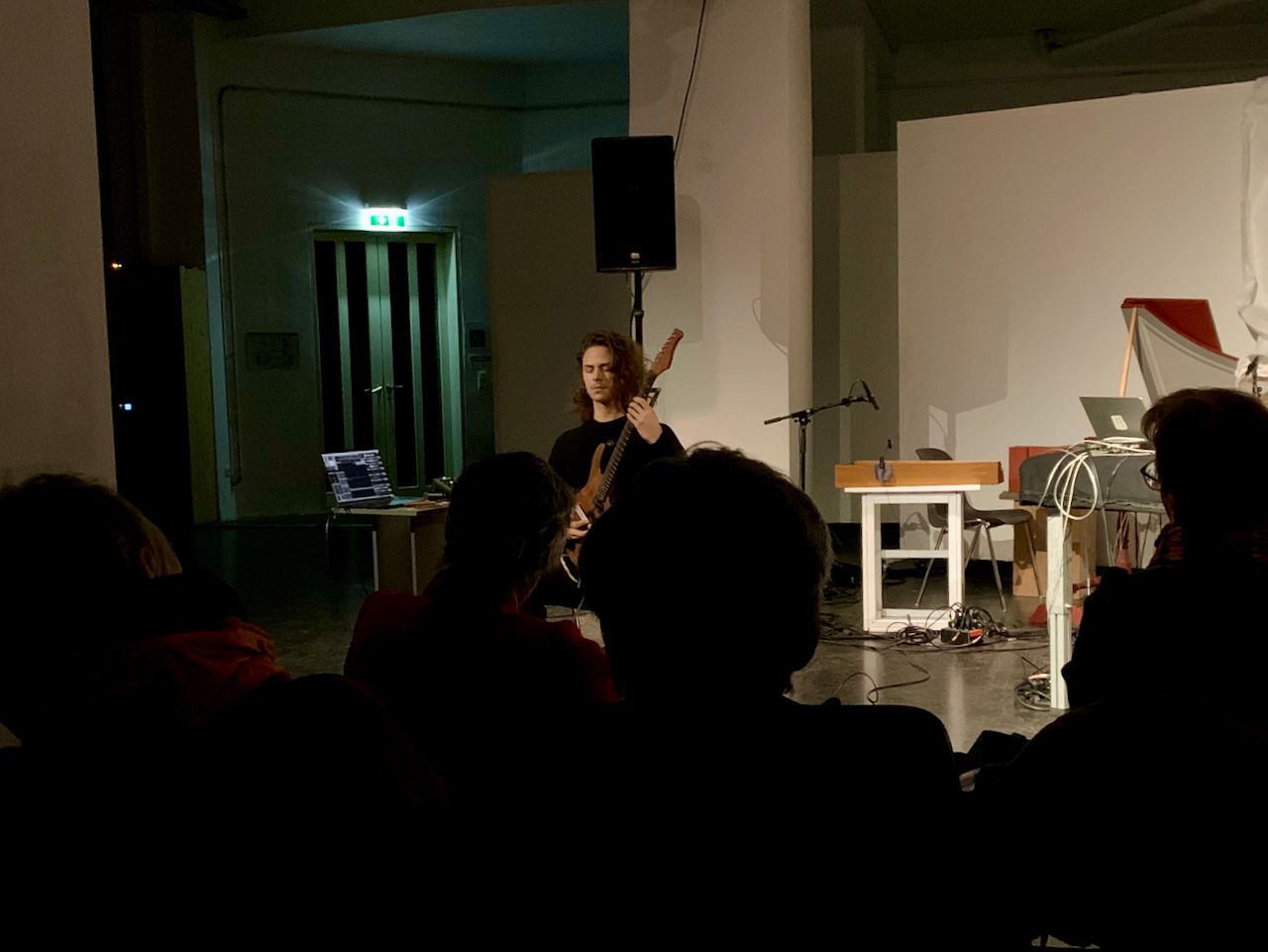 im konzert werden die objekte parallel zur klangprojektion als instrumente gespielt und mit dem installationsklang gemischt. der strom von sich veraendernden klaengen wandert von den haengenden, nachklingenden zu den liegenden, gedaempften instrumenten, der klang wird trockener, das geschehen dynamischer. die performance geht allmaehlich in eine kammermusikalische situation ueber, mit einem trio aus cello, grosser trommel und elektrischer gitarre. die installation verstummt und macht platz fuer schnelle aktionen und ploetzliche veraenderungen. der raum zieht sich um die musiker:innen herum zusammen und ermoeglicht naehe und intimitaet in der improvisation.